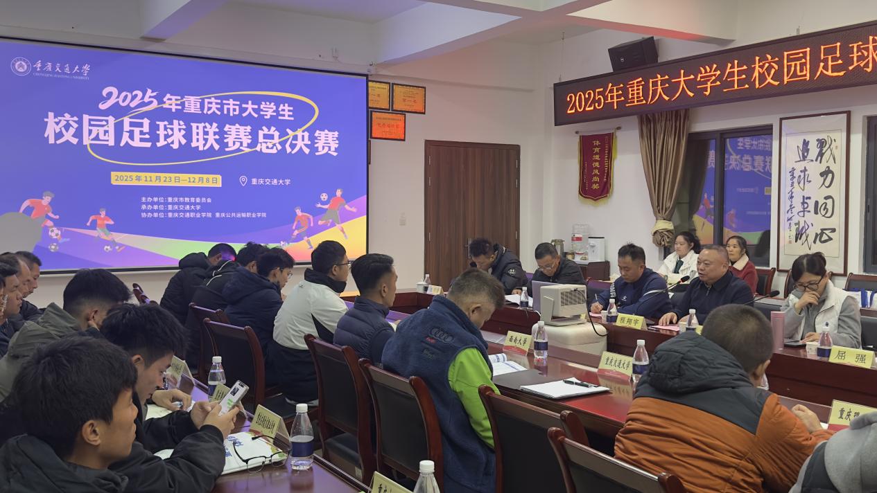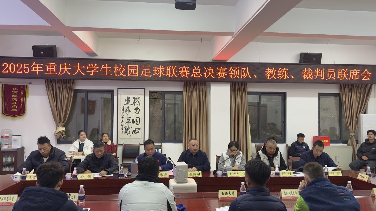 2025 年重庆市大学生校园足球联赛总决赛领队、教练、裁判员联席会,11 月 22 日下午在我校科学城校区体育部会议室召开。重庆市教委体卫艺处处长程翔宇,体育部党总支书记、主任隆承宏,市教委体卫艺处四级调研员任贞玲,及赛事监督、裁判长与各参赛队伍领队、教练员参会。