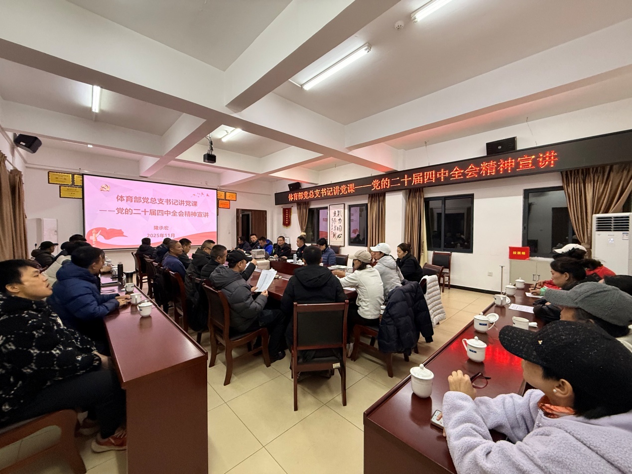 为深入学习贯彻党的二十届四中全会精神,切实把全体体育教师的思想和行动统一到党中央决策部署上来,体育部党总支于12月30日晚在科学城校区体育馆会议室召开专题党课,党总支书记隆承宏为全体教职工做党的二十届四中全会精神宣讲报告。会议由王祥林主持。