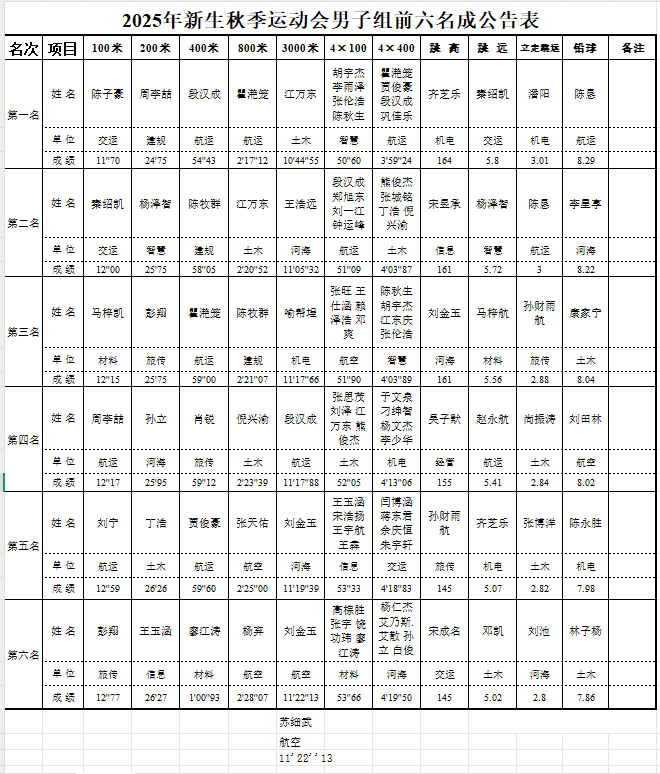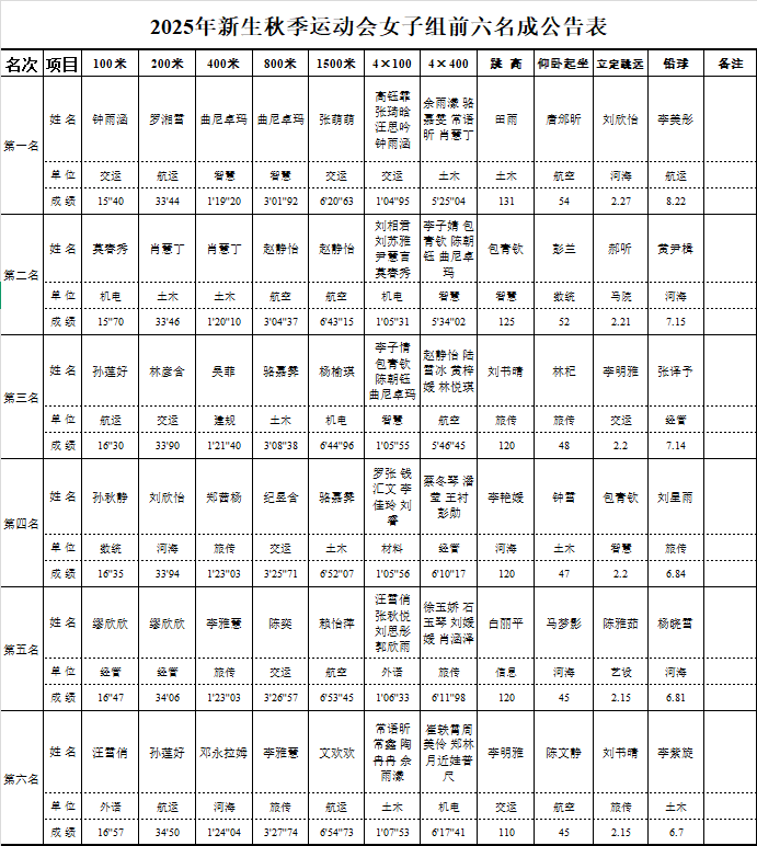 重庆交通大学2025年新生秋季运动会成绩公示