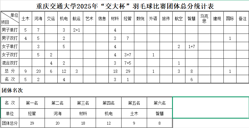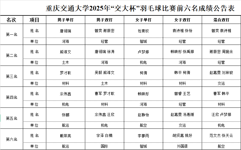 重庆交通大学2025年“交大杯”羽毛球比赛成绩公示